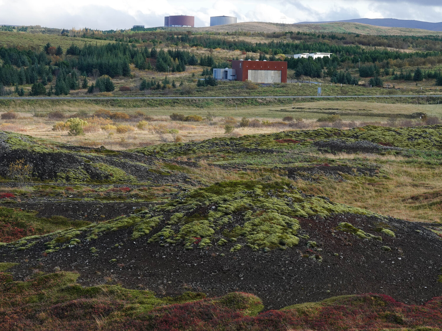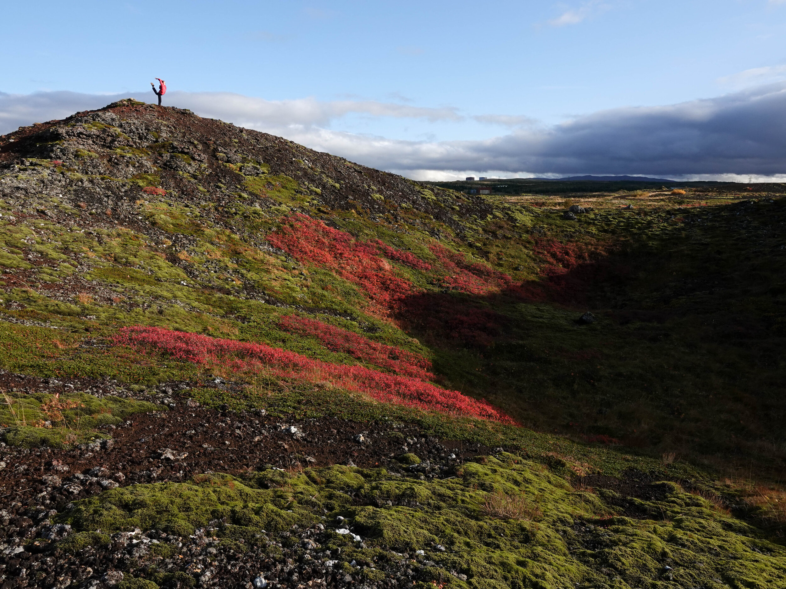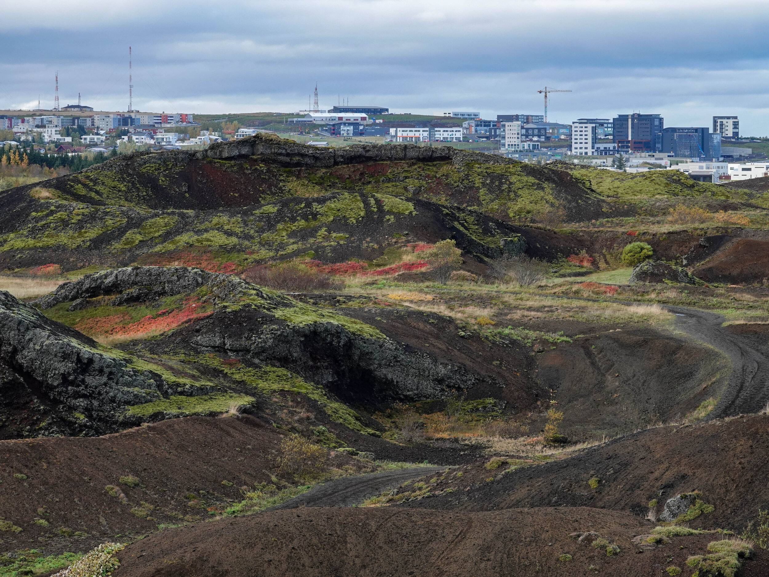 A completely surreal (though not unusual for Iceland) combination: a wild field of pseudocraters in shades of red, purple, brown, and black, covered with contrasting vegetation, with the suburbs of Reykjavík and cranes in the background.